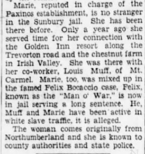 As it turned out, Marie would not serve out her full sentence; she was released in November of 1930 for good behavior, though one of the conditions of her release was that she would move out of Northumberland County and never return. She agreed to this stipulation and relocated first to Williamsport and then to Girardville, where Louis Moff owned and operated a number of seedy establishments. During Marie's absence, the Out-of Town Inn was placed under the control of David Hine, and continued to uphold its unsavory reputation.