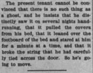 The following story, published in the Jan. 12, 1905 edition of the Latrobe Bulletin, describes one man's experiences with the ghost of a little girl-- a ghost with a terrifying habit of staring at him from the foot of his bed. The frequent appearance of this apparition drove the man out of his home, and was believed to be the spirit of a child who had died inside the home several years earlier.